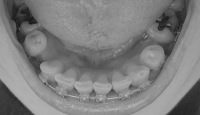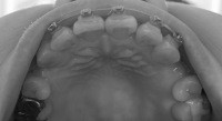歯が動くスペースがなくて前歯のねじれ(上1本と下2本)がなかなか取れないので、パワーチェーンで周りの歯を奥に引っ張り隙間を作ることに。